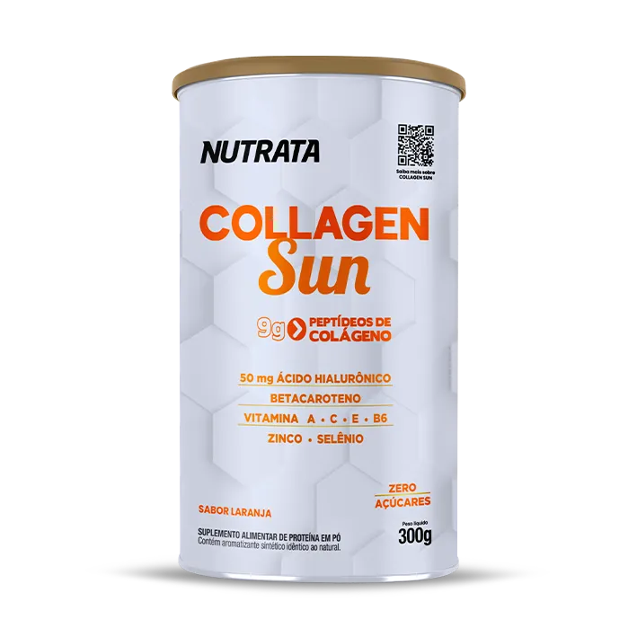 O Colágeno Sun Sabor Laranja 300g Nutrata é um suplemento com peptídeos de colágeno, ácido hialurônico e vitaminas antioxidantes, que promovem pele firme, unhas fortes e cabelos saudáveis, com delicioso sabor de laranja.