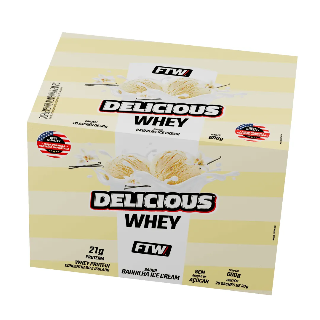 O Delicious Whey FTW display Baunilha Ice Cream oferece 20 sachês com sabor leve e alta performance nutricional.