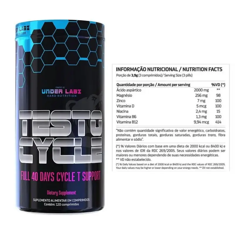 Aspartato (ácido aspártico), Arginina, Sulfato de magnésio, Aspartato de zinco, Óleo de Farelo de Arroz (Oryza Sativa L.), Óleo de Abacate (Persea Americana), Vitamina B6, (Cloridrato de Piridoxina), Vitamina B3 (Nitrato de Tiamina), Vitamina D3 (Colecalciferol), Vitamina B12 (Cianocobalamina), antiumectante, carbonato de cálcio e dióxido de silício.