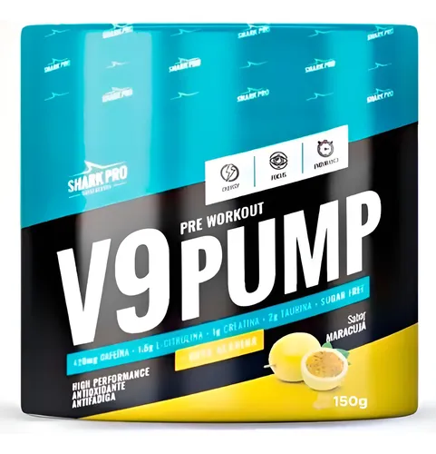 O V9 Pump Pré-Treino 150g Maracujá Combo com 6 Unidades Shark Pro é um pré-treino potente que proporciona energia, foco e resistência, ideal para treinos intensos com o sabor refrescante de maracujá.