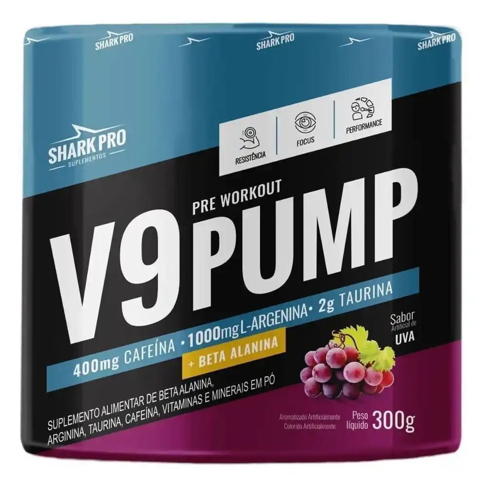O V9 Pump Pre Workout Uva 300g Combo com 6 Unidades Shark Pro é um pré-treino potente que combina energia explosiva, foco extremo e resistência prolongada com o delicioso sabor de uva, ideal para elevar sua performance ao máximo.