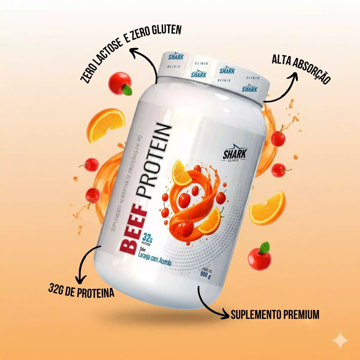 O Whey Beef Protein Laranja com Acerola 900g Shark Pro é um suplemento proteico à base de proteína da carne, ideal para ganho de massa muscular, recuperação muscular e alto desempenho, com sabor cítrico e refrescante.
